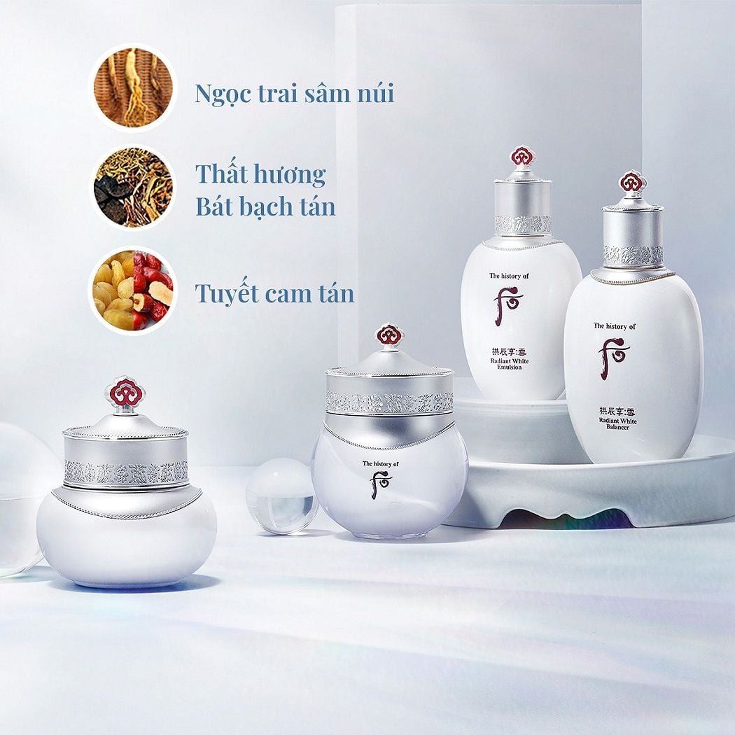 3. Emultion – Sữa dưỡng sáng da (20ml): Sữa dưỡng trắng da với thành phần làm trắng chiết xuất từ Cam Cúc và phương pháp bí truyền Hoàng cung thất hương bạch tán nuôi dưỡng làn da không tì vết, đem lại cảm giác mịn màng tươi mát.