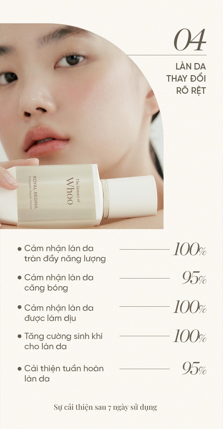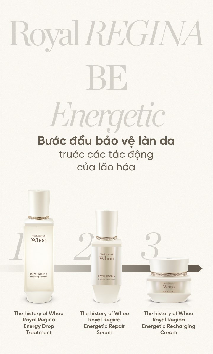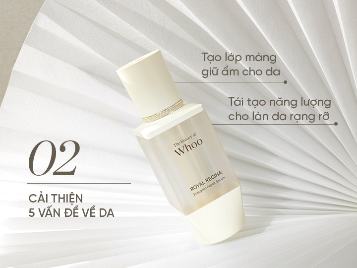 Whoo Royal Regina được sản xuất theo công thức Royal Amino Repair™ chứa 2 loại axit amin gồm Arginine và Glutamate và các thành phần đông y như nhân sâm, lộc nhung hươu giúp phục hồi năng lượng cho làn da khỏe khoắn, tái tạo các tế bào da bị tổn thương. Chăm sóc chuyên sâu cho làn da gặp phải nhiều vấn đề về chảy xệ, chùng nhão.