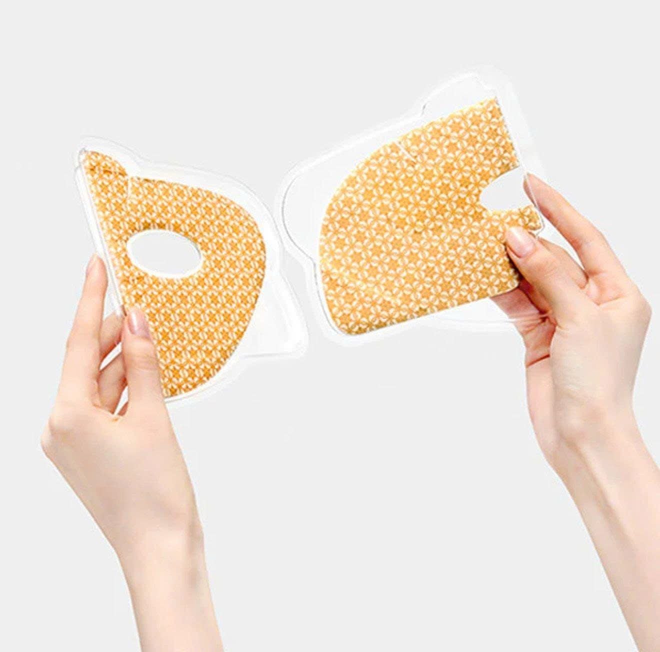 - Tách lớp film bảo vệ mặt nạ và đắp lên nửa mặt mỗi cái, canh chỉnh vị trí trán, mắt, mũi